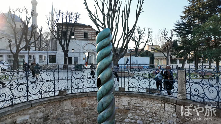 蛇の柱と呼ばれるこのブロンズのねじねじは、元は3匹の蛇が絡み合ったモニュメントでした。頭部が失われていますが、3つの頭のうちのひとつがイスタンブール考古学博物館にあるということです。観てみたいな〜。