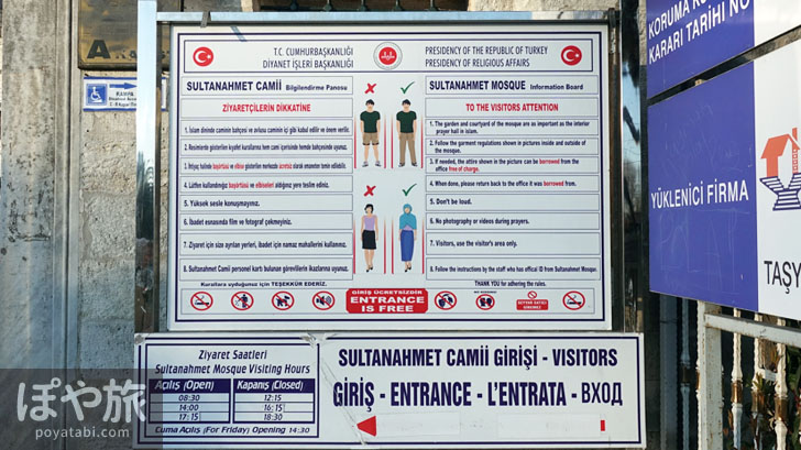 モスクに入るときは膝の見えない服装、女性は髪を隠す必要があります。無料で見学できます。