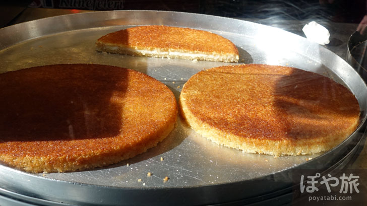 こちらがキュネフェ。そうめんのような細〜い麺(カダイフ生地)の間にチーズを挟んでバターで焼いたお菓子で、最後にレモン風味のシロップをたっぷりかけて完成です。熱々の状態でいただくスイーツ。