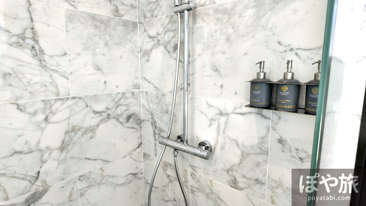 レインシャワー付きのシャワールーム。ハンドシャワーもあるので使いやすいです。