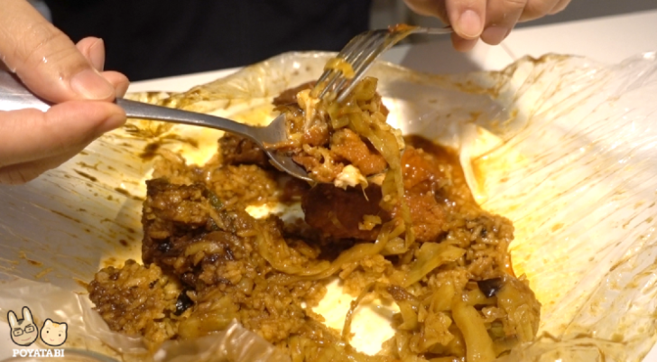 お味はスパイシーですが辛すぎず、ビニールで包まれていてそのままお皿に載せて食べることができるので食器も汚れなくてとても便利でした。