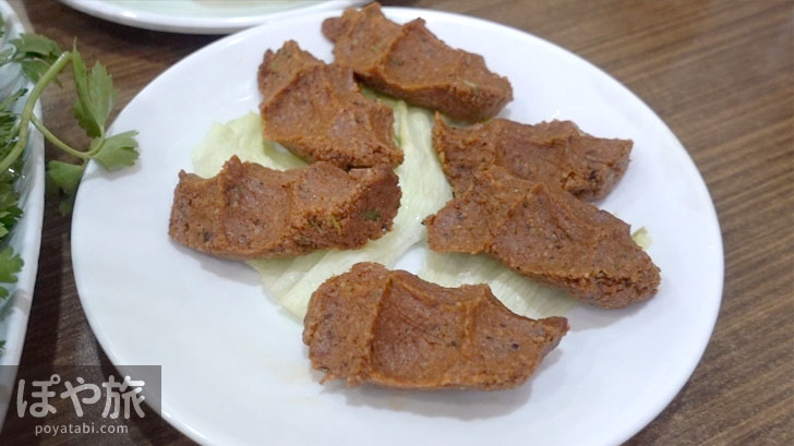 前菜として出てきたので、レタスにのせてレモンを絞っていただいてみました。スパイシーでなんと表現していいのかわからないのですが、美味しかったです。