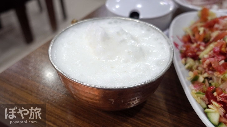 アイランは塩味のヨーグルトドリンクです。↑お店だとこのように泡だった状態で出てきます。(コンビニやスーパーではプラスチック容器入りのものがどこでも売られています)